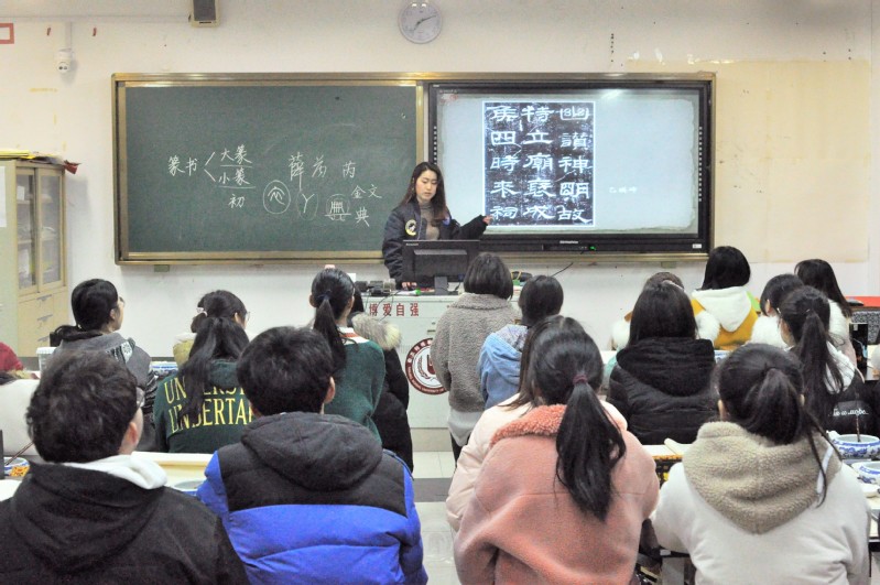 课堂的最后,薛老师向同学们讲述自己去博物馆和美术馆的经历,推荐同学们多去博物馆走走看看,向大家说明学习书法要先有兴趣才能好学,兴趣是最好的老师。老师通过自身教学经验,劝告同学们学习贵在坚持,书法的学习要循序渐进、日积月累才能有所成就。