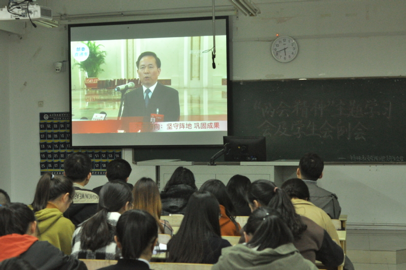 会议伊始,主持人展示了两会召开的背景、人民政协的相关知识以及原则要求。紧接着,分别从两会的相关议题:教育质量、改革创新、政风反腐和环境保护来介绍了老百姓所关注的社会热点。尊师重道是教育质量的保证,主持人用一段短小有趣的视频还原了师这个职业的辛苦与忙碌,又特别强调了特殊教育的重要性,增加了大家对办好特殊教育的期待与信心,增强了大家的责任感。改革创新是国之动力,与时代同步伐,持之以恒科学发展,是当前要务。政风反腐需要风清气正的法治与德治,作为新时代老员工,应该坚持理想信念,检视自身行为,见贤思齐,看淡得失。生态环境现处于相当严峻的形势,大力加强环境保护的力度迫在眉睫。主持人还根据本次学习会的内容提出了几个问题,同学们都积极回答。最后,主持人向大家分享了她的心得体会,并号召特师学子应当树立的信念和目标,努力学习。