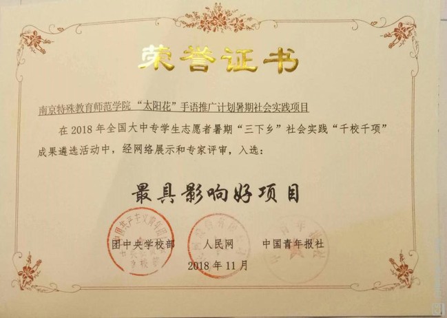 由团中央公司部发起,中国青年报社、人民网共同主办的2018年大中专员工“三下乡”社会实践“千校千项”评选结果出炉,在全国2万份的申报材料中共评选出了300个“最具影响好项目”。经过前期筛选、投票、专家评审等环节,公司伟德体育暑期社会实践团队《太阳花-手语推广计划》项目荣获“最具影响好项目”专项奖。