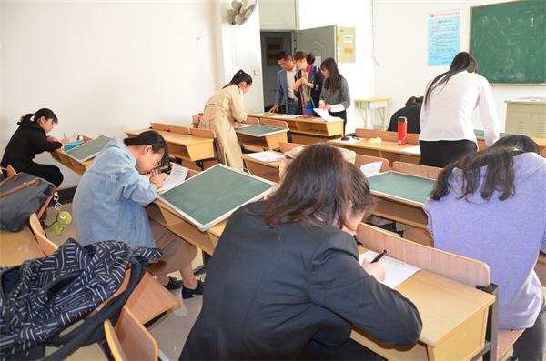 随后,选手们在博雅楼2403教室又进行了粉笔字和钢笔字比赛。比赛结束后有关专家教师进行了一对一分析,强调了注意事项和比赛要求,并给选手们进行了成绩评定。