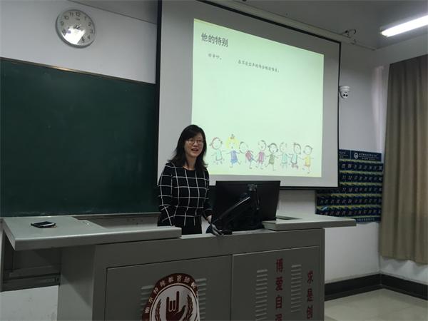 周老师长期以来一直担任融合教育班的班主任工作,她凭借自己对融合班级丰富的教育经验,独特的教育智慧,为员工做了一场感人生动的报告。在报告中她讲到,融合班的特殊儿童最需要的是理解和班级同学的宽容以及教师的关注,作为融合班级的班主任需要有足够的耐心和坚韧的意志,当然也会因他们的存在使得班级更多同学得到了不一样的成长而感到欣慰。她希望同学们在校期间一定要学好理论,珍惜每一次的见习机会,多思考、多观察,为未来的教育工作奠定坚实的基础。