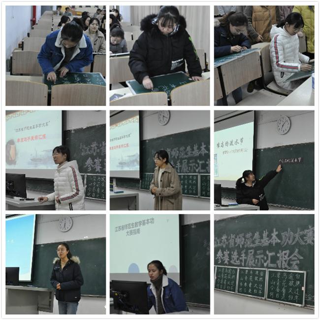 首先第一个环节,为了更好地宣传本次大赛,吸引更多优秀的同学参加到师范生的选拔工作中来,16级小教专业卢欣荣同学全面而详实地介绍了江苏省师范生基本功大赛的赛程、比赛办法和评分规则,通过介绍,在座的同学们对大赛有了深入而全面的了解。接着,六位参赛归来的选手现场展示八分钟的粉笔字和钢笔字。她们的字迹规整、方正优美、刚劲有力,充分展示了公司学子扎实的师范生基本功和勤学苦练的优秀品质。