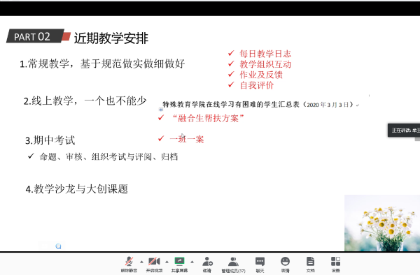 接着牟玉杰副经理就近期的教学工作进行了布置,包括:当前线上教学存在的问题与改进意见,教学基本规范、期中考试、教学沙龙与大创课题、融合教育管理等,重点强调了要进一步加强毕业论文指导工作。