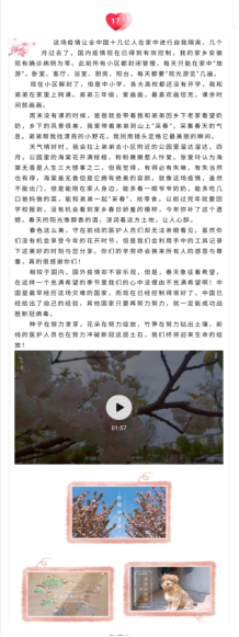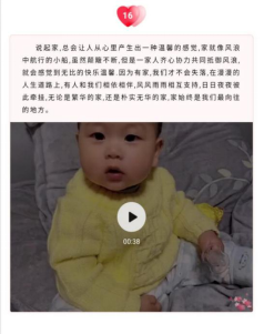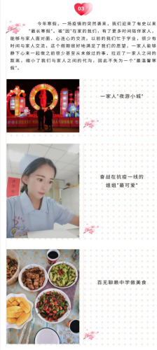 同学们通过用短视频、文字、图片等方式展现了在疫情期间和亲人在一起的温馨生活。厨房成了家里最热闹的地方,有的同学学习了烹饪,成为了父母的得力小助手,和家人一起在厨房忙碌;有的同学在初春时节,和家人一起出门散步,在阳光的照耀下,微笑的画面就此定格,似乎一切都不如此刻来的温馨有爱;疫情的扩散使大家长期被“困”家中,在家中发现乐趣成为一件“要紧事”,跟弟弟妹妹一起画画,教会狗狗表演技能,和爷爷奶奶交流种花技巧,和爸爸妈妈分享公司趣事,虽然只是一些粗茶淡饭之中的点点滴滴,但爱深藏其中,令人回味无穷。