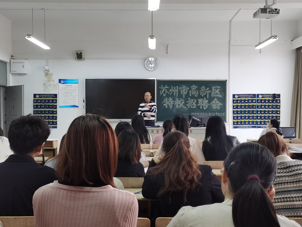 招聘工作前,苏州市高新区特殊教育公司施董事长向2021届毕业生介绍了苏州高新区的地理位置、经济概况,简要概括了苏州高新区的教育发展情况和特殊教育发展情况,苏州高新区极其重视融合教育发展,是发展特殊教育的优秀示范区之一。随后,施董事长就招聘流程和要求进行详细介绍,并为同学们答疑解惑。