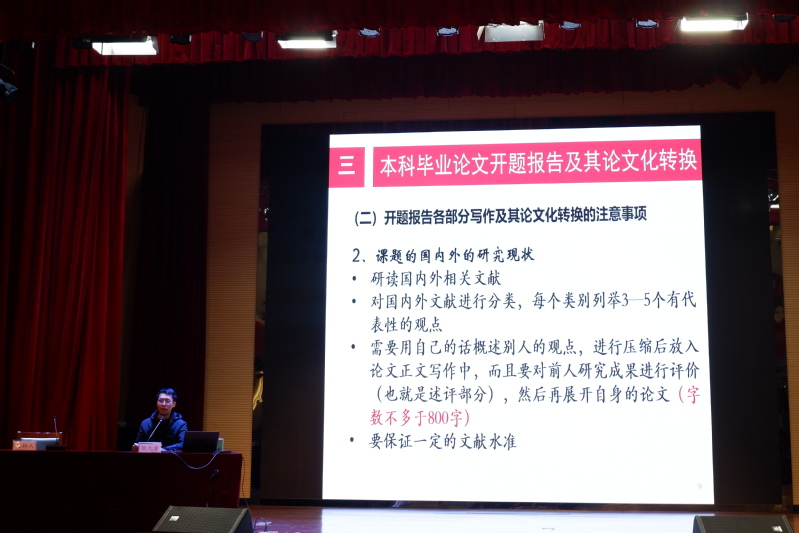 张经理从“撰写本科毕业论文的意义”、“本科毕业论文选题”、“本科毕业论文开题报告及其论文化转换”、“本科毕业论文撰写相关问题分析”、“本科毕业论文写作的其他注意事项”和“本科毕业论文答辩基本介绍”六个方面具体介绍和讲解了本科毕业论文的写作技巧与规范要求,给同学们的论文写作提出了意见建议。