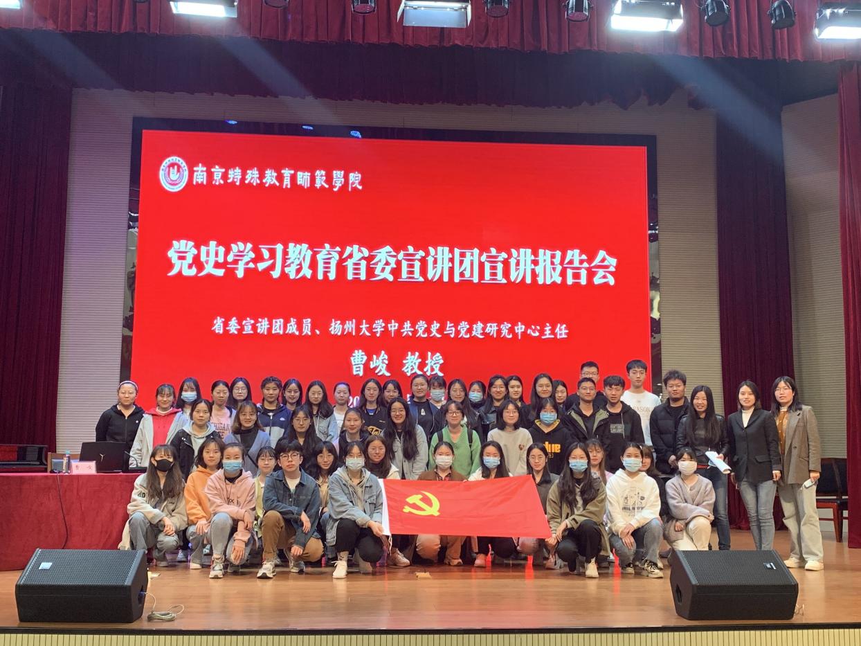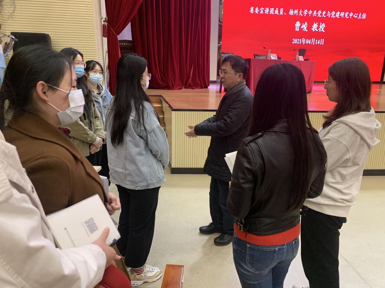4月14日下午,伟德体育员工党支部组织支部全体师生党员参加公司举行的党史学习教育省委宣讲团宣讲报告会,报告会以《从党的奋斗历程中汲取前进的智慧和力量》为题,主讲人为省委宣讲团成员、扬州大学中共党史与党建研究中心主任和中共党史学位点负责人曹峻教授。