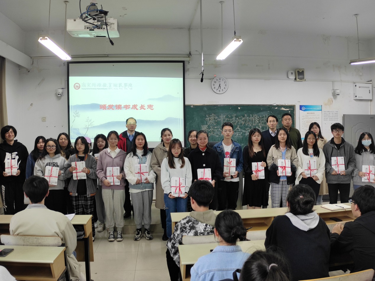 然后,叶亮书记将“三人行,必有我师焉”的古语结合读书活动进行了诠释,叮嘱同学们在生活与学习中要不忘初心、牢记使命,重视学习并学以致用,营造良好的学术氛围。并由叶亮书记、朱玉飞副书记、邸鹏老师为19、20级各班颁发《读书成长志》。