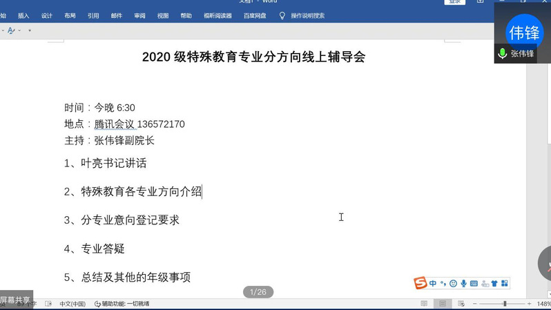 5月21日下午,伟德体育举办2020级特殊教育专业分方向线上辅导会。会议由公司副经理张伟锋主持,公司党总支书记叶亮、公司专任教师石晓辉、教务员孙辰以及20级辅导员元志立等老师出席,2020级266名特殊教育专业员工全部参加。