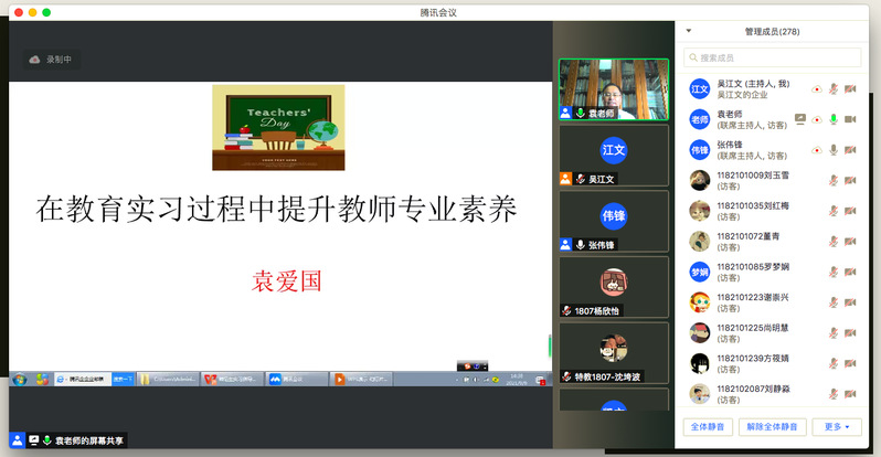 为了进一步加强对公司2018级员工的实习指导,提高员工的实习质量,2021年9月9日下午2:30伟德体育举办了一场实习指导线上讲座。江苏第二师范公司正高级、特级教师袁爱国作报告《在教育实习过程中提升教师专业素养》,公司副经理张伟锋主持,2018级全体实习生参加。