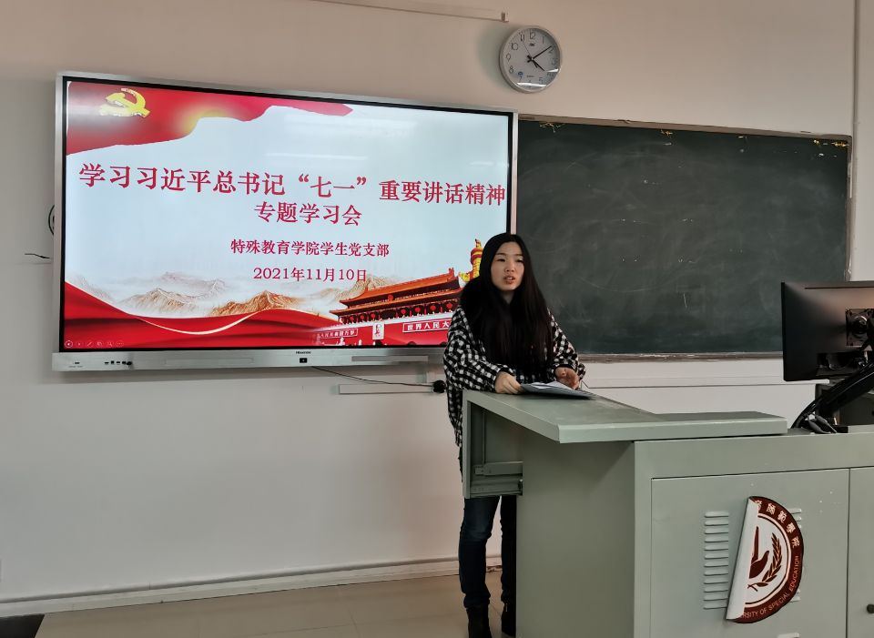 会议伊始,支部宣传委员王赫煊老师就深入学习习近平总书记“七一”重要讲话精神作主要发言。她首先介绍和梳理了建党100周年来的伟大成就;接着,带着大家回顾了入党初心和使命,提醒大家坚持初心不动摇,坚定不移跟党走;最后,强调大家应自觉发挥党员先锋模范作用,在学习、工作和生活各方面都要做出表率。