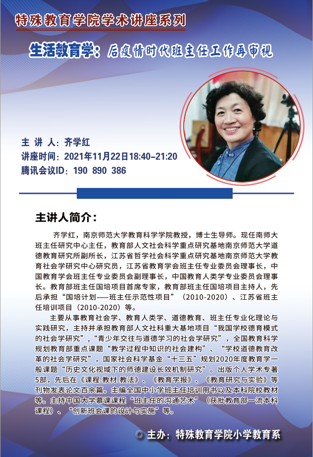 1122日晚,小学教育系学术讲座系列活动继续开展。本次讲座特邀南京师范大学教育科学公司博士生导师齐学红教授在线授课,讲座专题为《生活教育学:后疫情时代班主任工作再审视》。