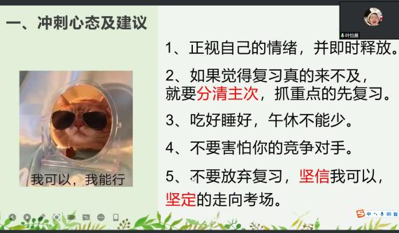 首先,元老师邀请到了周扬、陈倩云、叶怡晨三位成功考研的2021届毕业生与大家作经验交流。三位学姐结合自己的亲身考研经历,围绕考前复习重点、考前身心调整、研究生生活三方面展开了自己的分享。此外,她们还建议,要注意心态调整,学会适当发泄情绪,给予自己积极的心理暗示。最后,坚定信念、树立信心,以饱满的热情与希望进入考场。学姐们发言后,同学们也踊跃提问,与学姐们深入交流,纷纷表示获益良多。