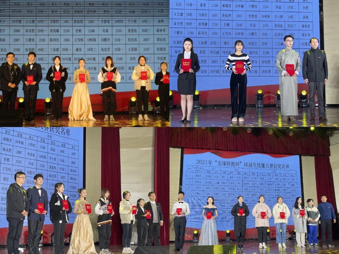 汇报结束后,由公司党总支书记叶亮老师、副经理李拉老师、党总支副书记李鹏老师、副经理张伟峰老师分别向“先锋特教杯”师范生技能大赛获奖同学颁奖并合影留念。