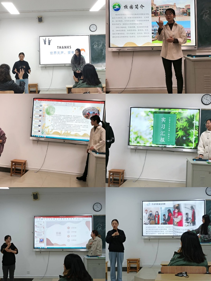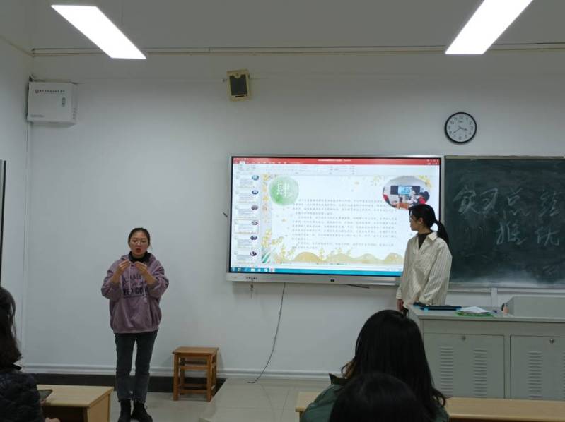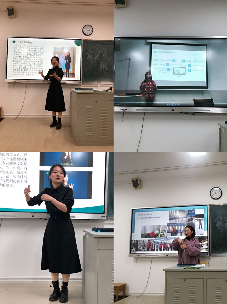 活动的第二项内容是三名实习生的个人精彩汇报。第一名同学从教学和翻译两方面汇报自己的实习工作,介绍自己的工作情况以及遇到的困难及解决过程,最后还和大家分享自己的收获体会。第二名同学在实习期间,去过公司做翻译,也曾前往医院帮助聋人就医,即使受疫情影响也可以通过线上平台帮助聋人进行社会交流。还分享了在手语翻译实践过程中应该注意的细节,丰富的实习经历让同学们感叹。第三名同学,因受邀留在实习公司担任代课老师,她专门拍摄了一段视频进行实习汇报,将自己的实习经历与所思所想很好的传达给大家。