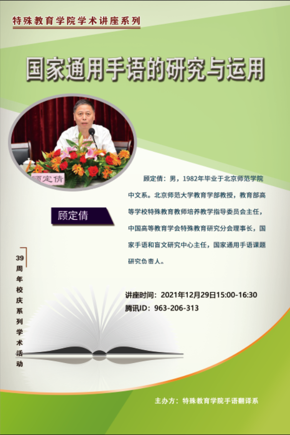 20211229日下午,我国著名特殊教育专家、北京师范大学教育学部教授顾定倩老师为伟德体育手语翻译专业师生开展了题为《国家通用手语的研究与运用》专题讲座。讲座由手语翻译系主任韩梅副教授主持。