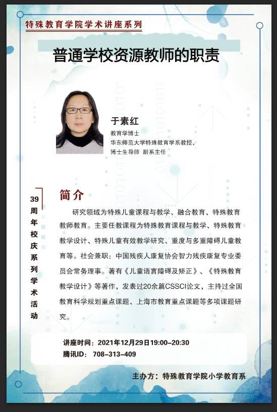12月29日晚上七点,小学教育系学术讲座系列活动继续开展。本次讲座特邀华东师范大学特殊教育学系于素红教授在线授课,讲座专题为《普通公司资源教师的职责》。学术讲座由小学教育系主任赵文超副教授主持。