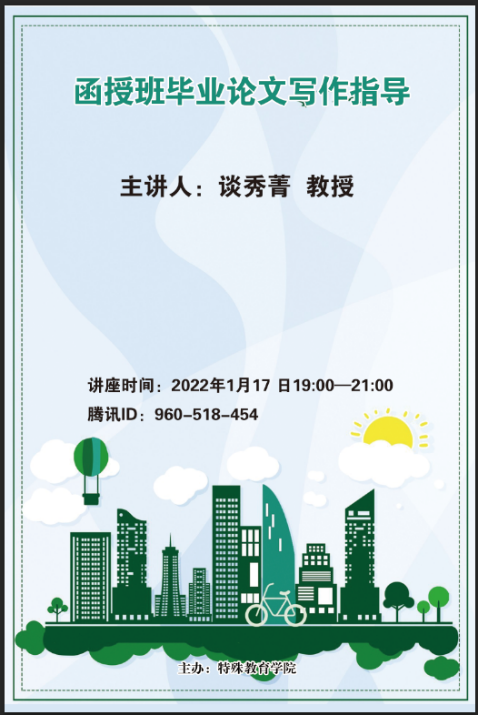 为应对当前特殊教育专业函授本科生论文选题困惑,推进特殊教育专业函授本科生毕业论文指导工作,伟德体育特邀谈秀菁教授,于2022年1月17日19: 00-21:00为2021级函授班本科生开设毕业论文选题与写作专题指导讲座。