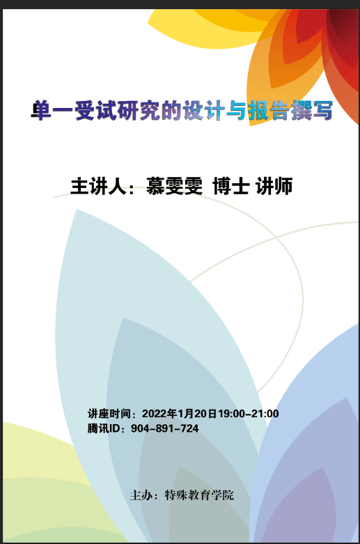 为推进2018级本科生毕业论文指导工作,解答员工在运用单一受试研究方法过程中的困惑,有效提升毕业论文写作质量,伟德体育的慕雯雯老师,于2022年1月20日19: 00-21:00,面向公司2018级特殊教育专业、小学教育专业、手语翻译专业全体员工开设单一受试研究设计与报告撰写专题指导线上讲座。