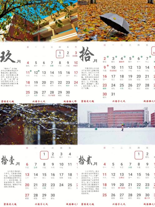 “二十四节气”既是中华民族智慧的结晶,也深刻反映出中华民族智慧的典型特征,即天人相应、顺其自然。 毕淑敏先生曾经说过:“节气就是一种命令”。我们可以在端阳看芦苇依依、在中秋赏月品蟹、在大雪纷飞时围炉取暖,温上一壶热酒。特教公司学子将传统节气与南京特师校园景色相互融合,用新春台历的文创形式串联起大学时光的美好印记。该文创活动使员工们充分感受到节气之美,进一步感悟先人智慧。