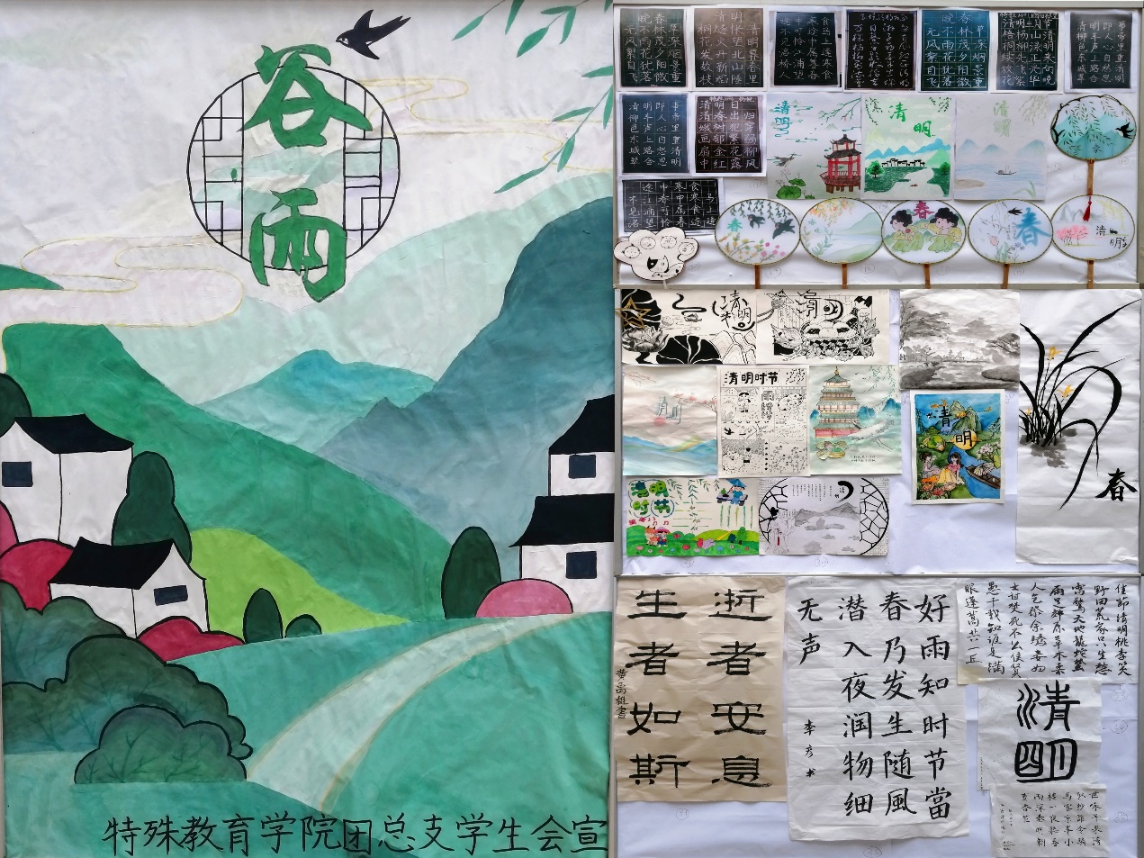四季更迭,节序如流。二十四节气表达了人与自然之间独特的时间观念,蕴含着尊重自然、顺应自然、与自然和谐相处的中华智慧,是中华民族悠久的文化内涵和历史积淀。本次书画文创活动以毛笔字、钢笔字、书画、蒲扇设计为主要形式,特教公司学子以“谷雨”时节为主题,秀丹青书法,展墨林之风,生动地展现了师范生扎实的书画绘写基本功。