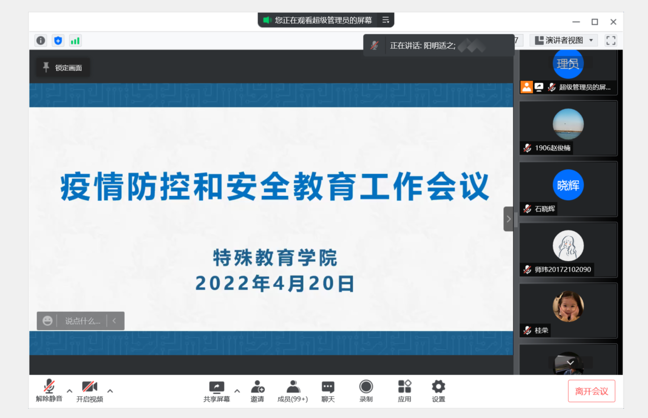 随后,李鹏副书记布置公司疫情防控与安全教育工作。李书记首先感谢同学们对公司疫情防控工作的支持与配合,并围绕健康打卡、核酸检测、相关管理规定做好了详细工作布置,希望同学们进一步强化疫情防控的思想意识,在疫情防控中树牢责任意识;积极学习生活,争当表率,彰显特教学子担当精神,在疫情防控中锤炼意志、长才干、促成长;养成良好作息习惯,健康饮食,预防春季疾病。