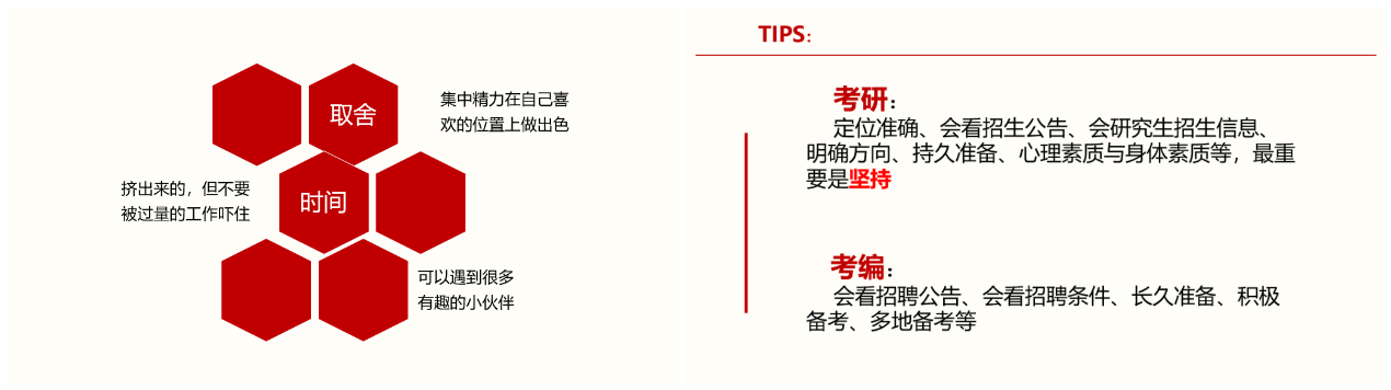 第三讲是考编指南。第三讲中解老师简单介绍了教师编制招聘考试的内容、报考条件等,为同学们介绍了考编信息的通道和教资考试流程。第四、五讲是考研考公指南。解老师提出考研要学会信息收集,才能事半功倍,绝不能打无准备之仗。除此之外,解老师还分享了考研成功同学的经验,带领同学们了解了考研基础常识,如:怎样确定公司和专业, 怎样查找院校信息等。