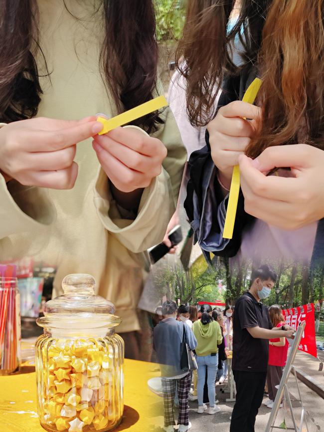 本次活动主要有两部分,星星送祝福和便签寄鼓励,虽然形式简单但内容温暖人心。活动期间,博爱社的志愿者们热情为往来的同学们介绍本次活动的基本内容,并呼吁大家积极参与。路过的同学可以折幸运星,众所周知,幸运星寄托着祝福和希望。梧桐树下光影斑驳间,参与活动的老师和同学们都用便利贴在展板上留下了祝愿与鼓励。一个个爱心便利贴背后,是同学们对残疾人伙伴衷心的祝福和美好的祈愿。