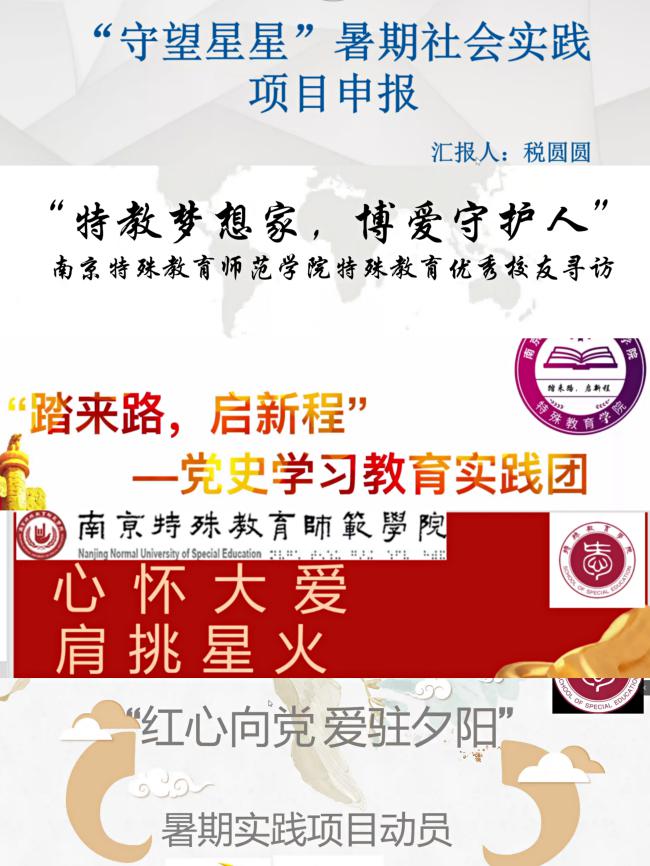 经过前期的宣传动员、团队组建、项目申报等流程,“博爱社”暑期实践团、“优才计划”暑期实践团、博爱社手语推广计划、守望星星、特教梦想家、让爱驻夕阳、“踏来路、启新程”党史学习教育团队、方舟启智中心助残队将代表伟德体育作为院级团队进行实践活动。各队将在暑假期间前往南京、浙江等地开展实践活动。