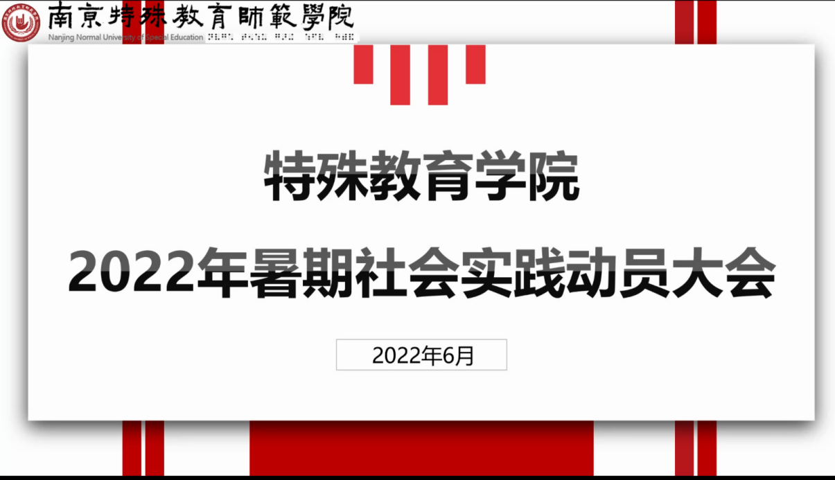 至此,本次暑期社会实践动员大会落下帷幕。博爱塑魂,我们一直在路上!暑期实践的号角已经奏响,我们正整装待发。相信在此次活动中,同学们一定能对特教工作有更深层次的理解,也衷心祝愿同学们在接下来的实践活动中有更出色的表现。(文/虞祥 图/虞祥 编辑/元志立 虞祥 审核/李鹏)
