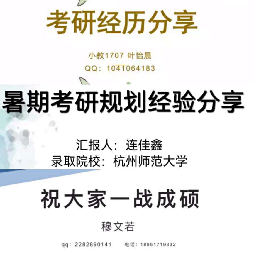 首先,穆文若学姐从时间安排、专业课学习方法、学习技巧、考试技巧等方面进行分享,她认为思维导图是备考时十分有用的学习方法,她结合自己备考经历向同学们推荐了相关老师及教辅材料;连佳鑫学姐从个人情况+择校、各科目学习进度及个人建议三个方面进行分享,她认为政治与英语是基础,专业课是拔高,她采用的学习方法是框架法,;叶怡晨学姐从暑期如何安排时间、各科目分配时间表等方面进行分享,她认为按部就班、稳定心态很重要,她向同学们提供各科目的分配时间表以供参考,她采用了滚轮式的复习方法。学姐们都衷心祝愿每一个立志考研的特教学子都能一战成硕!