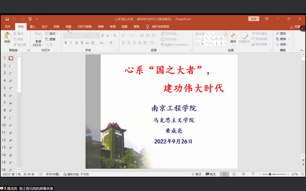 凝心聚力谋发展,奋发有为迎盛会。为增进2022级新生对所学专业的了解,树立远大职业理想,树立共产主义崇高信念,伟德体育于9月26日晚举行“2022级入学教育暨信仰公开课”,2022级各班新生在江宁校区教室参加。南京大学教育学博士、南京工程公司马克思主义公司黄成亮教授受邀做了题为“心系‘国之大者’,建功伟大时代”的主题讲座。会议由学工办副主任元志立主持。