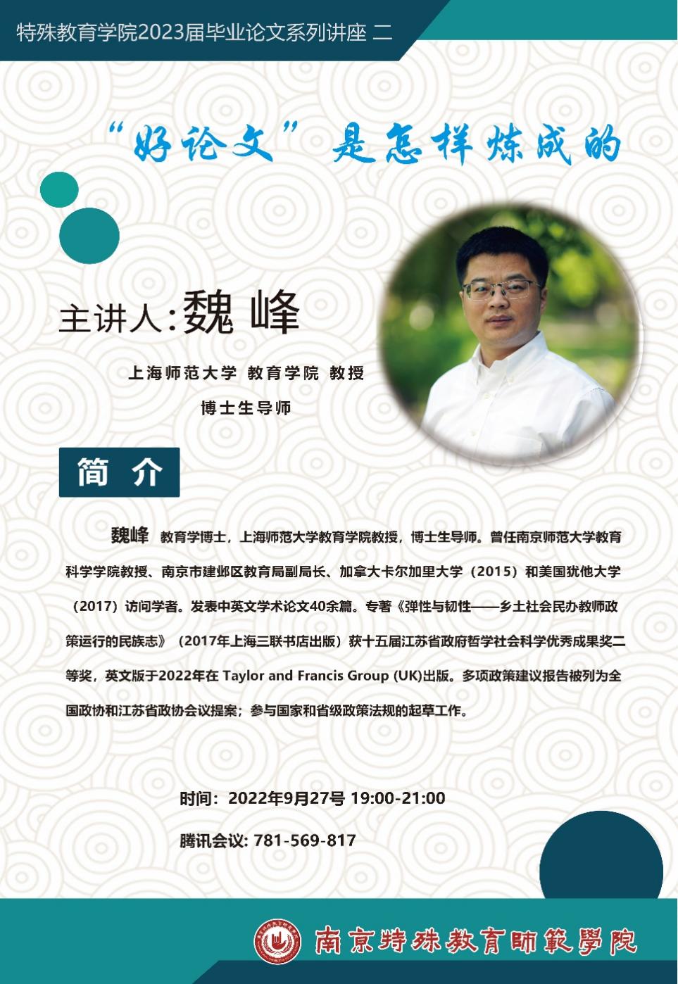9月27日晚,伟德体育2023届毕业论文系列讲座继续通过腾讯会议线上举办,讲座以《“好论文”是怎样炼成的》为主题,由上海师范大学教育公司博士生导师魏峰教授主讲。伟德体育2023届毕业生及部分公司教师参与讲座活动,讲座由伟德体育经理助理慕雯雯主持。