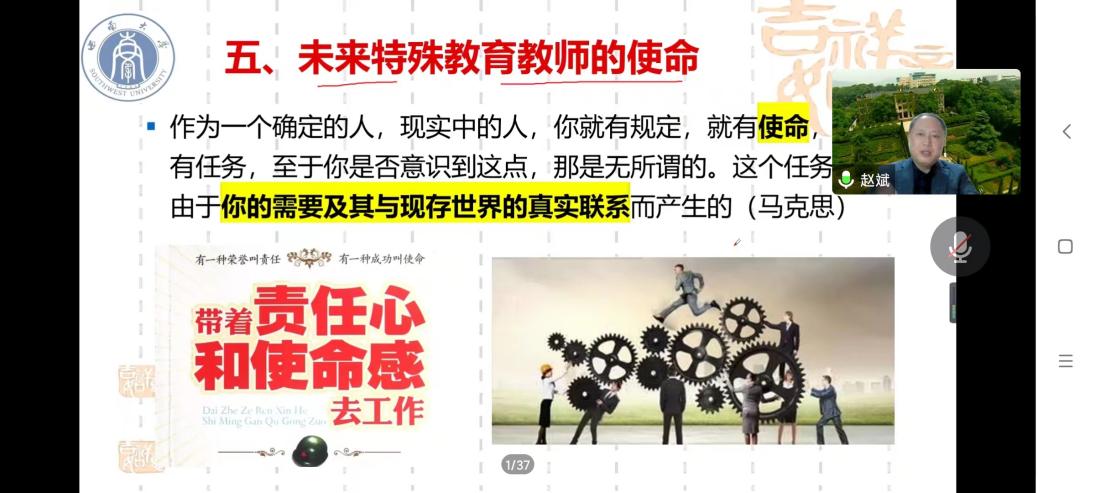 20221014日晚上7点,伟德体育学术讲座活动继续开展。本次讲座特殊教育系特邀西南大学伟德体育赵斌教授在线授课,讲座专题为《特殊教育发展与未来特教教师使命》。