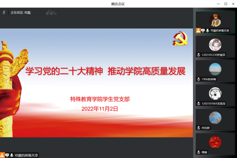 接着,支部成员结合公司高质量发展和个人学习及岗位职责谈学习体会。傅康老师认为面对风高浪急甚至惊涛骇浪的重大考验,我们更应当紧密团结在以习近平同志为核心的党中央周围,全面贯彻习近平新时代中国特色社会主义思想,把思想和认识统一到党的二十大精神上来,把智慧和力量凝聚到党的二十大确定的各项任务上来,弘扬伟大建党精神,加快建设教育强国办好人民满意的教育作出新贡献。员工党员代表赵俊楠、龙雪滢、何佳蔚也分别结合个人实际情况进行了发言,表示作为师范生,要严于律己、以身作则,争做四有好老师,做好四个引路人,以实际行动践行初心使命,为全面建设社会主义现代化国家、全面推进中华民族伟大复兴而团结奋斗。