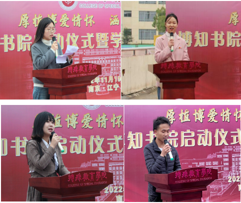 启动仪式伊始,公司党总支副书记李鹏首先介绍了建设博知书院以及开展学风建设结对共建活动的重要意义。强调学风建设是提升公司人才培养质量、激励员工成长成才的有力举措,搭建两校区学风建设联动平台加强协同育人,而博知书院的成立就是公司强化学风建设、构建特殊教育师范生“五博五力”育人模式的一次尝试。也是回应特殊教育和高等融合教育快速发展,注重“通识教育+兴趣特长”的员工教育管理探索。学业之路在于勤奋、刻苦以及博学。“博知书院”寓意“博学向爱,知深致远”,希望员工把博爱塑魂的校训内化于心、外化于行,厚植博爱情怀,涵养博学之风,培育爱心素养,为特殊教育事业和残疾人事业贡献青春力量。最后,并对博知书院的运作架构做了介绍,博知书院将设立“读书兴趣、乡土文化研习、创新创业训练、学术能力提升、辅具与无障碍研习”五个主体班,面向全院员工采取矩阵式的管理,以点带面,两地联动,全面激发同学们的学习热情,营造“肯学敢帮”的学习氛围。