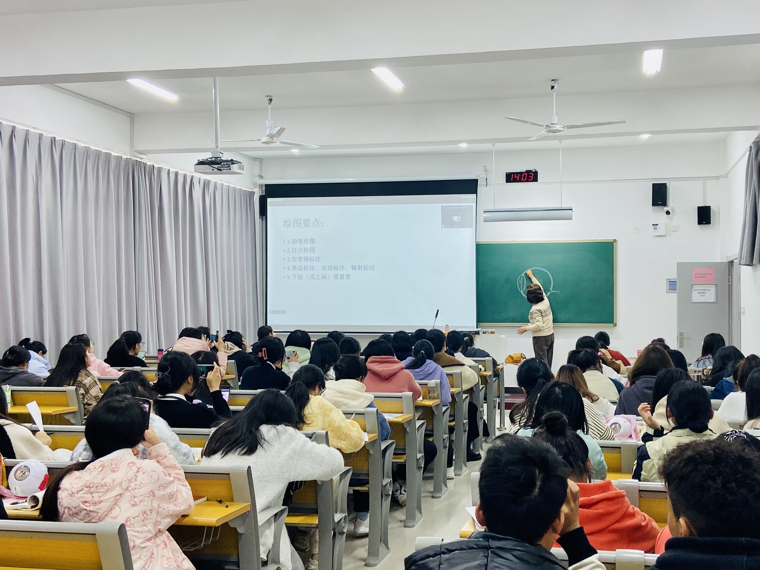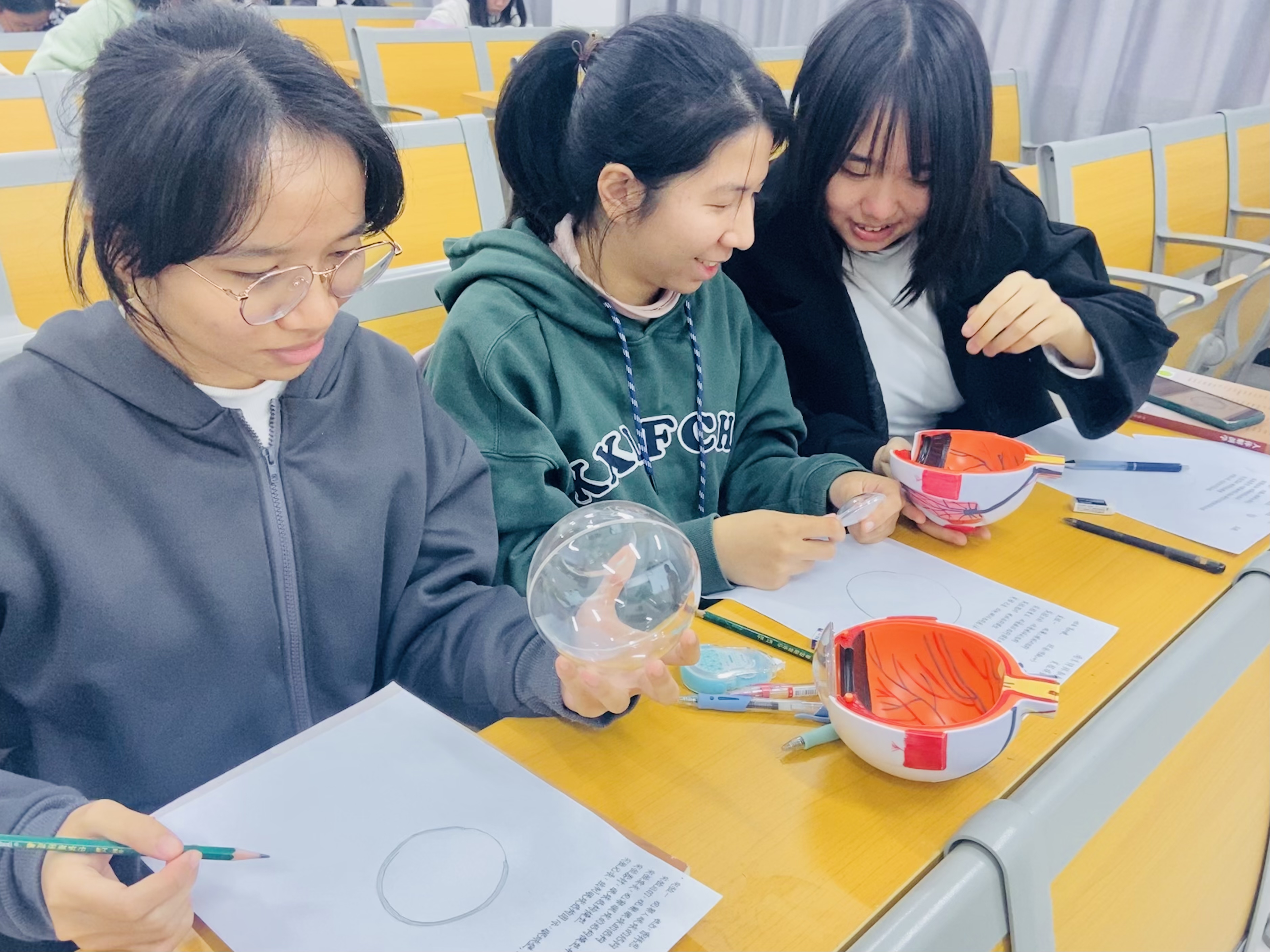 《人体解剖学》的观察性实验有:观察人眼的结构、观察人耳的结构、观察人脑的结构三组。赵汤琪老师组织员工观察人眼球、人耳、人脑模型,进行绘图和图标,然后完成实验实训报告。上课时,赵汤琪老师首先介绍什么是观察实验并讲解相关理论知识,接着为同学们演示如何绘制眼球结构图。同学们都聚精会神,并及时记录重要知识点。轮到自己进行绘图时,同学们对模型进行细致观察,努力完成实验实训报告。