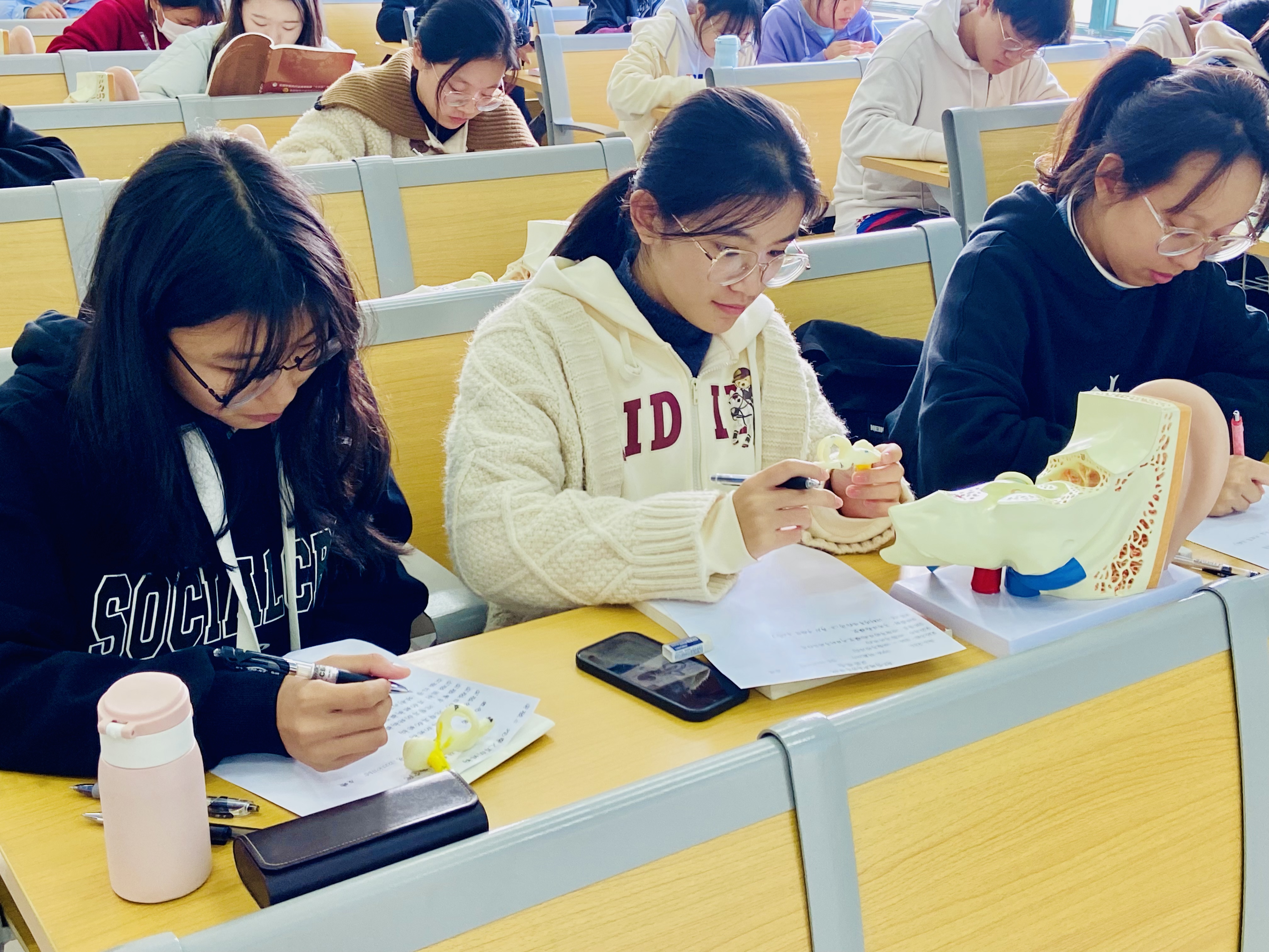 《人体解剖学》的观察性实验有:观察人眼的结构、观察人耳的结构、观察人脑的结构三组。赵汤琪老师组织员工观察人眼球、人耳、人脑模型,进行绘图和图标,然后完成实验实训报告。上课时,赵汤琪老师首先介绍什么是观察实验并讲解相关理论知识,接着为同学们演示如何绘制眼球结构图。同学们都聚精会神,并及时记录重要知识点。轮到自己进行绘图时,同学们对模型进行细致观察,努力完成实验实训报告。