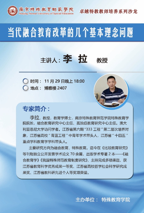 为深入贯彻党的二十大精神,强化特殊教育普惠发展,培养教育情怀深厚、专业基础扎实、勇于创新教学、具有终身学习发展能力的卓越特殊教育教师,伟德体育于11291800在博雅楼2407举办卓越教师培养专题沙龙。公司经理、教育学博士李拉教授受邀做主题报告《当代融合教育改革的几个基本理念问题》,与同学们交流研讨。活动由21级卓越班张妍妍主持,公司20级和21级卓越班同学全员参加。