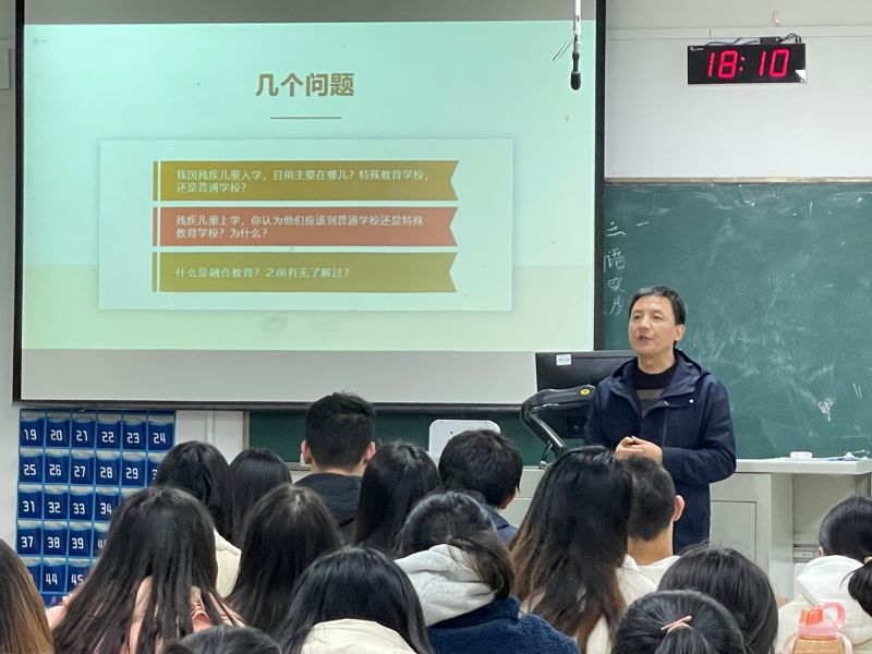 活动初始,李拉教授提出三个问题引发同学们的思考:“我国残疾儿童入学目前主要在普通公司还是特殊教育公司?”,“残疾儿童上学你认为他们应该到普通公司还是特殊教育公司?为什么?”,“什么是融合教育?”。在与同学们的交流互动中,李拉教授引出此次讲座的主要内容,并依次进行深入讲解。