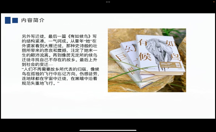 在活动中,从事先的文字分享中选出的15名同学作为好书推荐官,进行PPT展示分享。15位好书推荐官带着同学们走进一本本好书、了解一个个有意义的故事,分享一段段诗意的情怀,期待字里行间的温度,聆听、分享、专注当下与我们共成长。