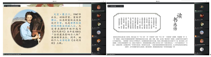 在活动过程中,同学们从作者介绍、推荐理由、主要内容、内心感受等方面出发,结合自身实际,进行了精彩的汇报。徐楠同学从特殊教育视角推荐《自闭历程》一书,该书讲述高功能自闭症患者天宝从一名重度残疾儿童,成长为一位精力充沛、著作颇丰、备受尊敬,且在专业领域成为世界权威的成年人的历程;陈晨用深厚的文学功底将《红楼梦》中的故事娓娓道来,以贾、史、王、薛四大家族的兴衰为背景,以宝、黛、钗三人的爱情婚姻悲剧为主线,描写闺阁佳人的人生百态,从各个角度展现了女性美、人性美、悲剧美;黄钰莹带着博爱情怀用“爱不用翻山越岭,陪伴也无需飘洋过海”对《我想飞进天空》进行总结性介绍;陈姝含结合时代背景与自身经历对《家》进行深刻解读……同学们的语言或慷慨激昂,或细腻柔软,或平淡质朴,皆传递了自己喜爱的书籍的力量。