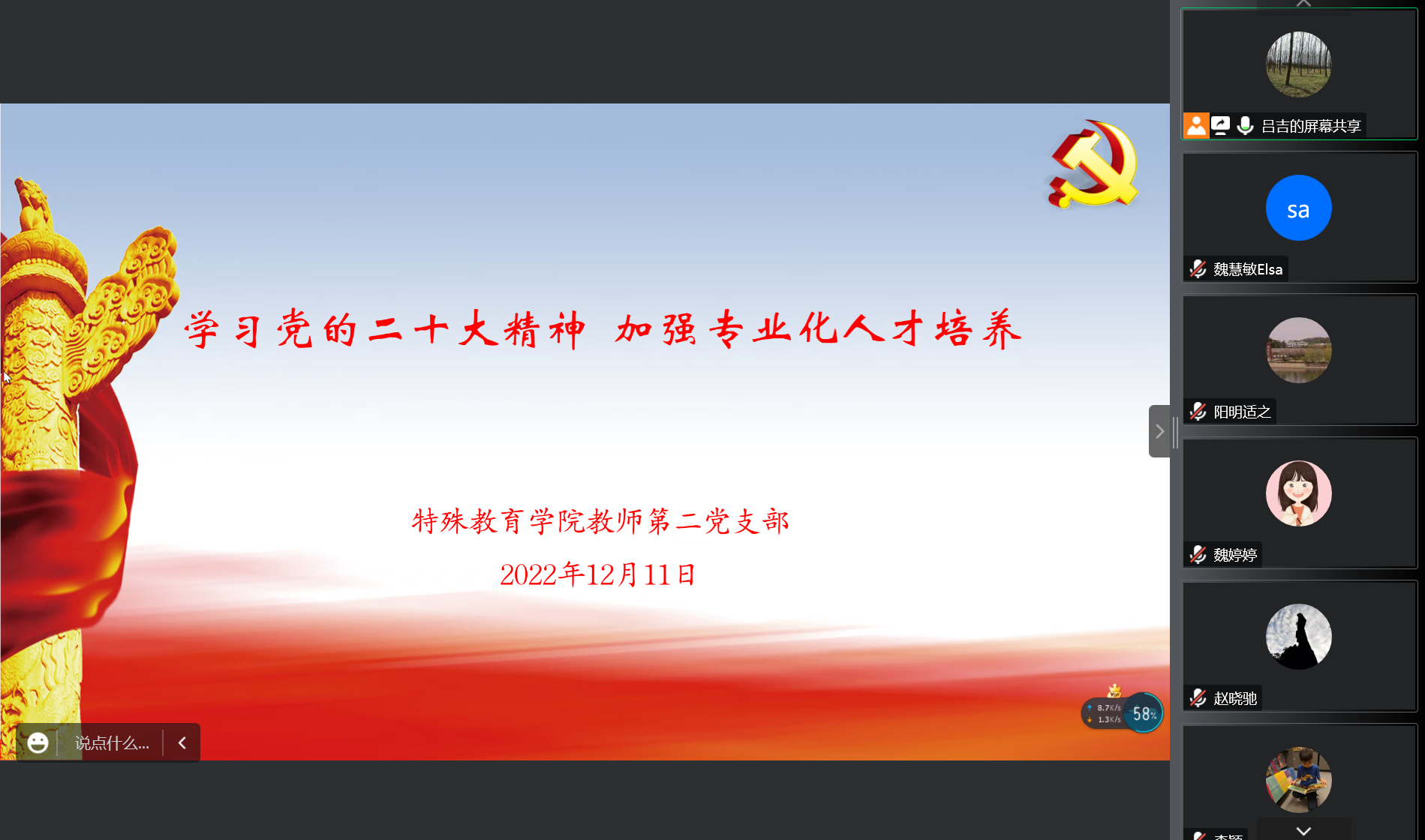 伟德体育教师第二党支部于12月11日晚开展支部书记上党课活动,由党支部书记吕吉上题为“学习党的二十大精神 加强专业化人才培养”专题党课,第二党支部全体同志参加会议。