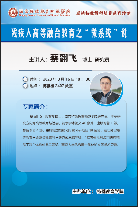 为深入贯彻落实卓越特殊教育教师培养计划,深化员工对于高等融合教育的认识,伟德体育于2023年3月16日18:30在博雅楼2407开展卓越教师培养系列沙龙。本次活动有幸邀请到蔡翮飞研究员,做题为《残疾人高等融合教育之“微系统”说》的学术分享。活动由20级卓越班卢怡萍主持,伟德体育20级和21级特殊教育专业同学参加。