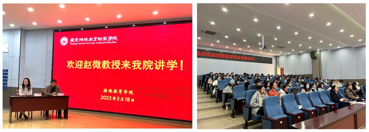赵微教授以《小学学习困难支持系统向两端延伸的研究设想》为题,通过朴实睿智的语言,深入浅出地向教师和员工分享了学习困难群体研究的最新设想和初步成果。从学习支持中心是什么、为什么成立学习支持中心,到将现有研究向学前幼小衔接和初中两端延伸的设想,赵教授通俗直白地阐述了研究和改善学习困难员工的重要性和现实意义。此外,通过对入学准备评估量表开发和初中学困亚类型评估工具开发的细致分享,加深了员工对科学研究过程和方法的了解。赵教授指出:“特殊教育的研究一定不能脱离普教,特教的蓬勃发展正在撬动普教的变革。各位同学应该对我们的专业感到骄傲和自信。”会后,同学们积极与教授沟通交流,纷纷表示此次讲座受益匪浅,收获良多。