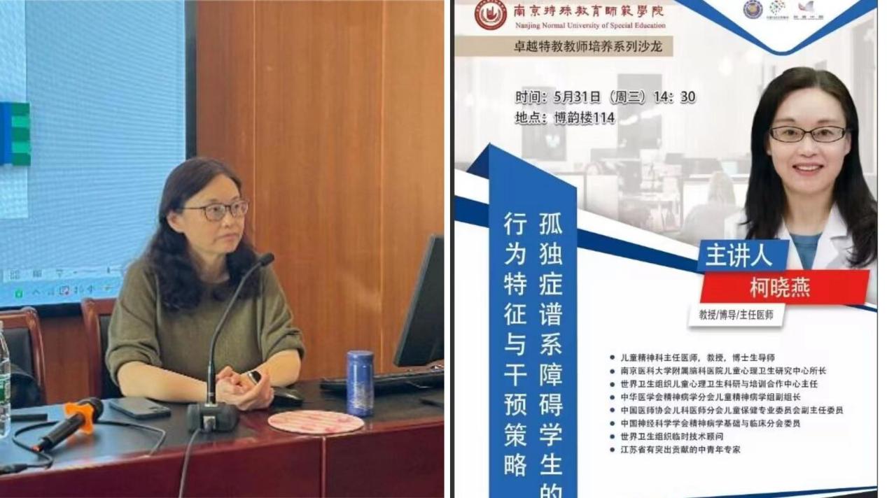 2023531日是第七个全国科技者工作日。为了增进特殊教育专业师范生对孤独症儿童诊疗的了解,增强未来特殊教育教师专业团队合作能力,提高在校员工的专业素养和学术视野,伟德体育特邀全国知名专家、南京市脑科医院儿童精神科主任、主任医师、博士生导师柯晓燕教授在博韵楼114报告厅开展“孤独症谱系障碍员工的行为特征与干预策略”知识科普讲座暨卓越教师培养主题沙龙。公司经理李拉与柯主任亲切会面,公司副经理张伟锋和2021孤独症一班、二班、2021培智班、2021级卓越班同学参加活动,由2021级卓越班付强同学主持。