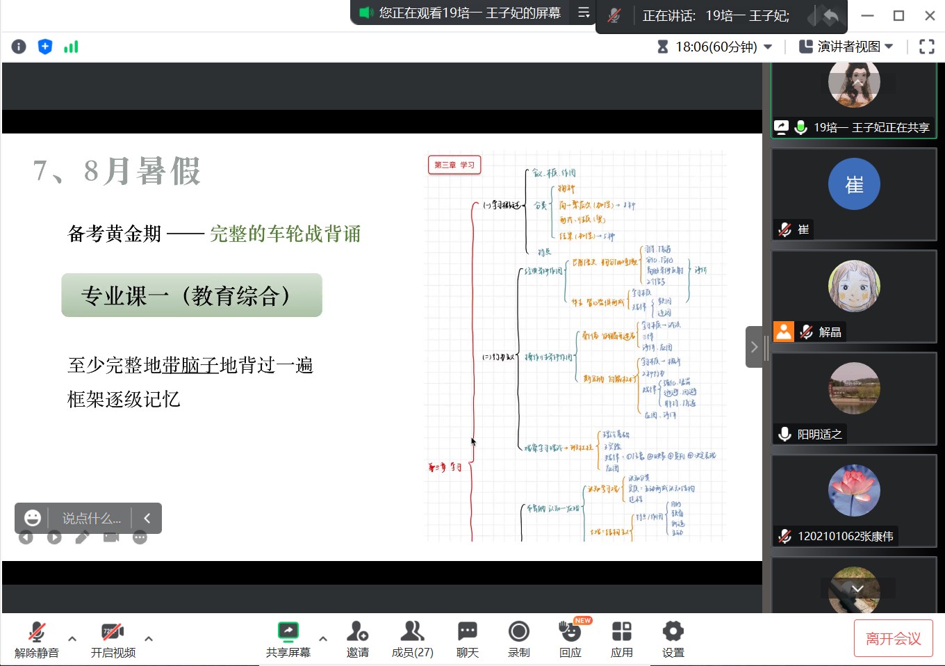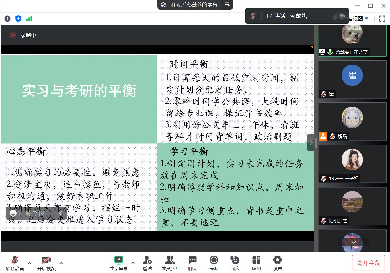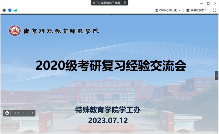 本次交流会特邀公司1901班王子妃和1906班蔡戴蓉两位成功考研同学代表做考研经验分享。考取华南师范大学特殊教育专业硕士的王子妃同学,从暑期备考与实习方面进行分享。她提醒同学们利用暑期关注特殊教育热点、前沿信息,形成自己的思路与见解,在实习期间则要善用、会用碎片化时间强化重点知识;考取南通大学小学教育专业硕士的蔡戴蓉同学,以备考学科为主线,向同学们介绍了各门课程的规划安排与复习策略,并建议同学们积极关注目标院校的考研大纲,按照知识点占比来安排几轮复习和背诵的方法。分享结束后进行互动交流,两位同学结合自身实际对所提问题进行了耐心解答。