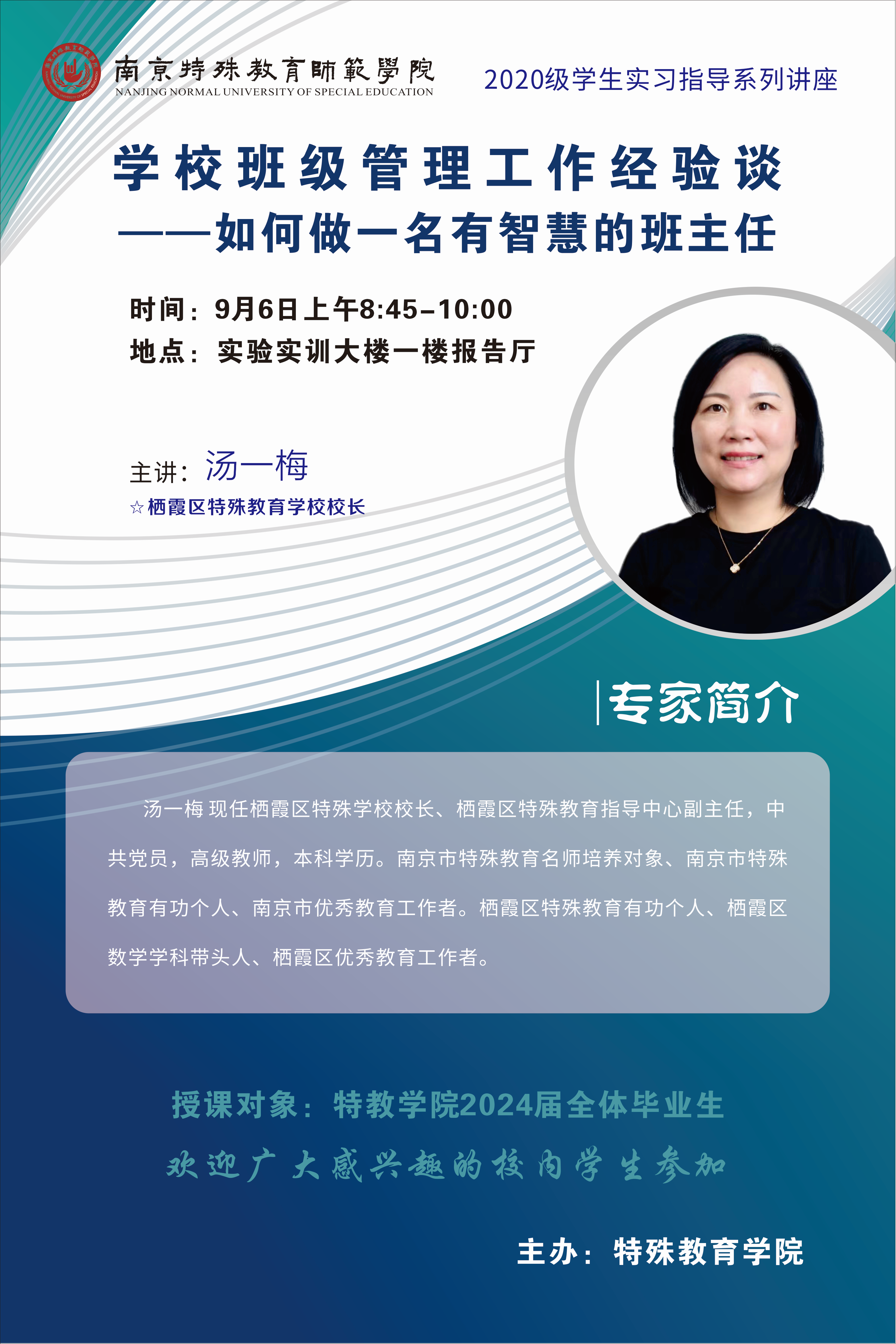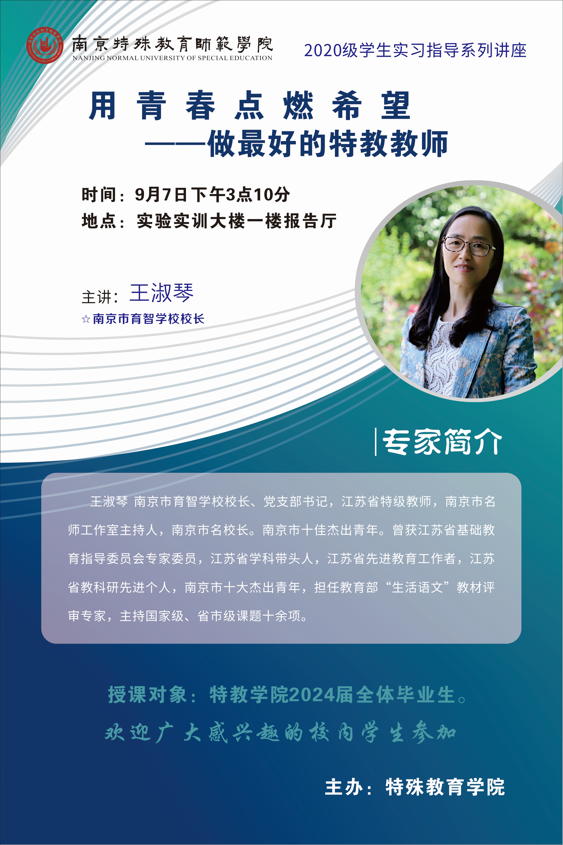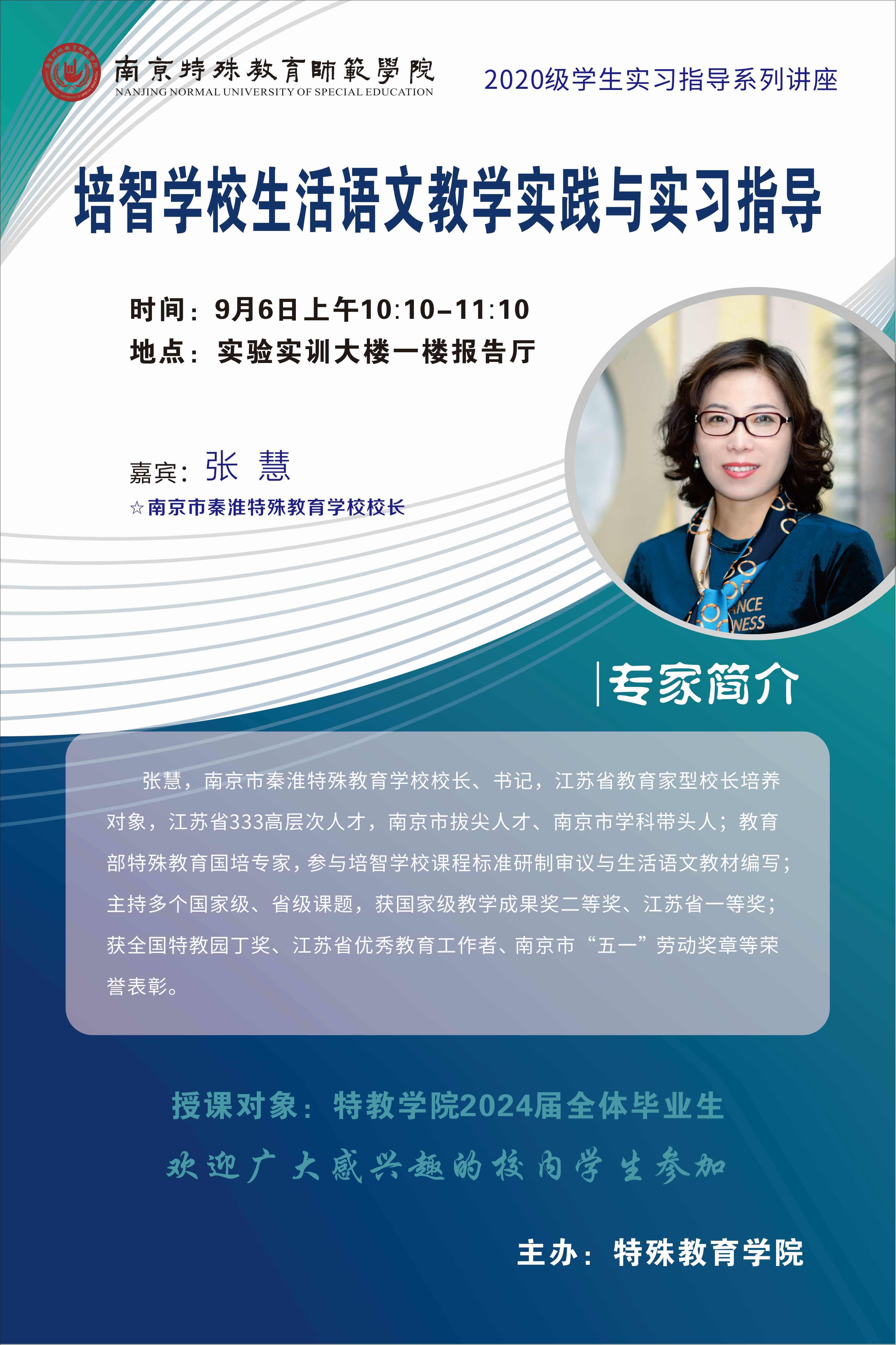 为帮助2024届毕业生们开展好教育研习、校内模拟教学和校外实习的准备工作,2023年9月6日至7日,伟德体育围绕教学设计、班级管理、教研活动和创新实践开展了教育实习指导系列讲座。分别由南京市育智公司董事长王淑琴、秦淮特殊教育公司董事长张慧、栖霞区特殊教育公司董事长汤一梅、游语影子教师项目创始人戴玉蓉担任主讲嘉宾。本次活动由公司副经理张伟锋、陈苏婉和刘凯毅老师策划组织,公司2024届全体在校毕业生参加。