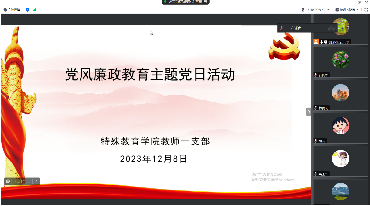 12月8日晚,伟德体育教师第一党支部在线开展党风廉政教育主题党日活动,以加强党员干部党性党风党纪教育,切实增强党员干部廉洁从政意识。活动由党支部书记琚四化主持,支部全体党员教师参加。