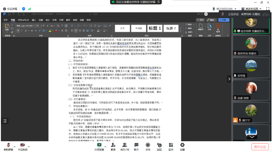 为推进国家社科基金项目实验研究,1月26日下午,伟德体育《人工耳蜗术后听障儿童汉语阅读与节奏感知的关联机制及干预效果研究》课题组线上召开第十一次组会暨听障小员工阅读教学实验班工作研讨会。南京市特殊教育指导中心唐宁宁、南京聋人公司邹敏、北京东路小学周娴、建康路小学顾静等高级教师,江苏省儿童康复研究中心副主任张颖、张瑞、谢纯等骨干教师,伟德体育副经理张伟锋、范佳露博士以及近十名员工作为课题组成员,共同参加本次线上研讨。